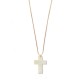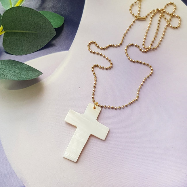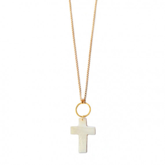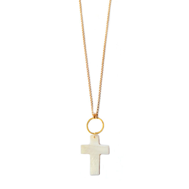 Handgemaakte ketting met een kruis van schelp aan een metalen gehamerde ring. Deze ketting is geschikt om wat langer te dragen en ook leuk in combinatie met andere kettingen.