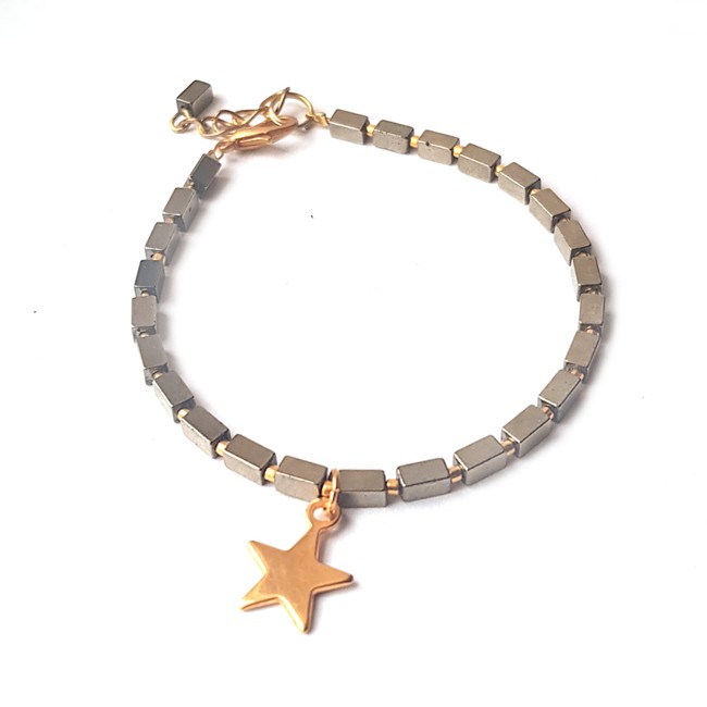 Handgemaakte armband met rechthoekige kralen van halfedelsteen (5x3 mm) en ster van nikkelvrij metaal. Ook mooi in combinatie met andere armbanden.