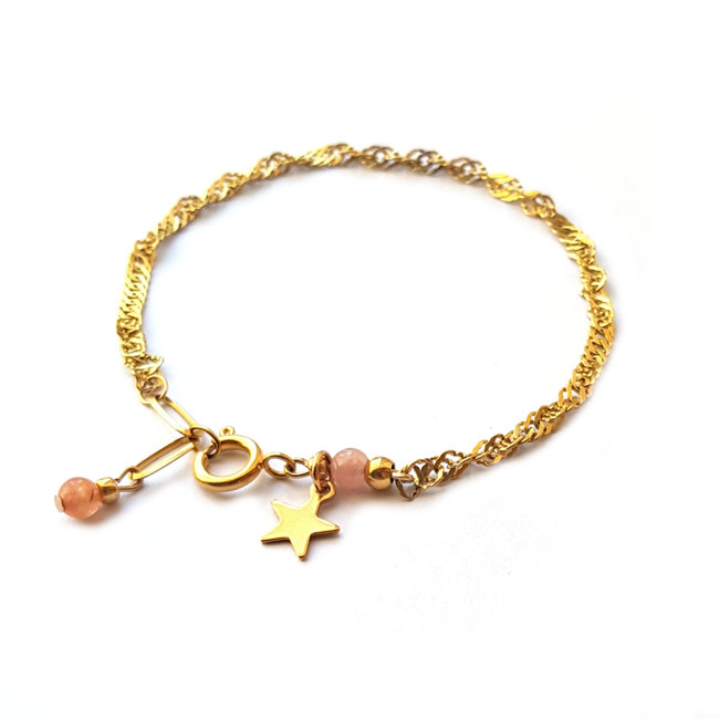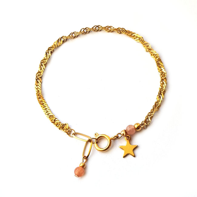 Handgemaakte stijlvolle & speelse armband van rvs en halfedelsteen (maansteen) met een mooie symbolische betekenis. De sluiting maakt deel uit van het ontwerp. Draag deze aan de voorkant van je pols zodat de overgang naar de grovere ketting en de twee mooie bedels (ster en kraal) goed te zien zijn.