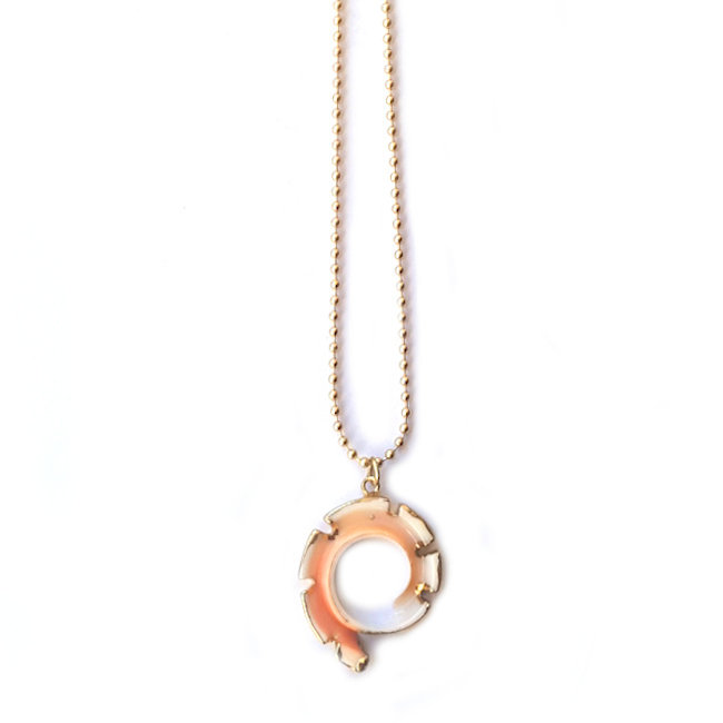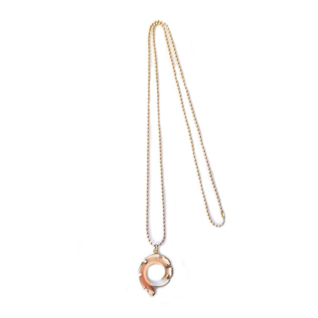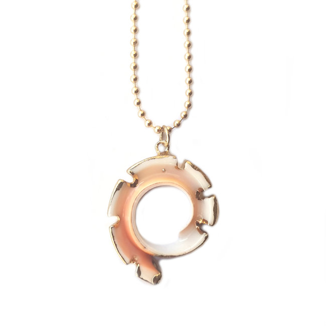 Handgemaakte ketting met een prachtig gevormde schelp in een mooie kleur met goudkleurige accenten. Deze ketting is geschikt om wat langer te dragen en ook leuk in combinatie met andere kettingen.