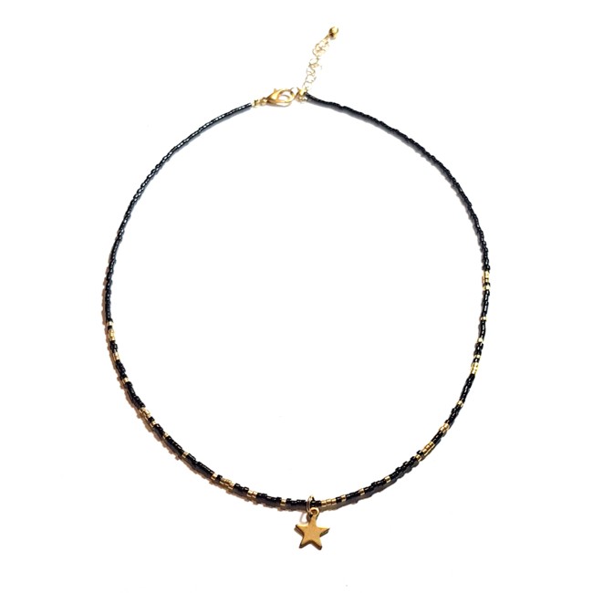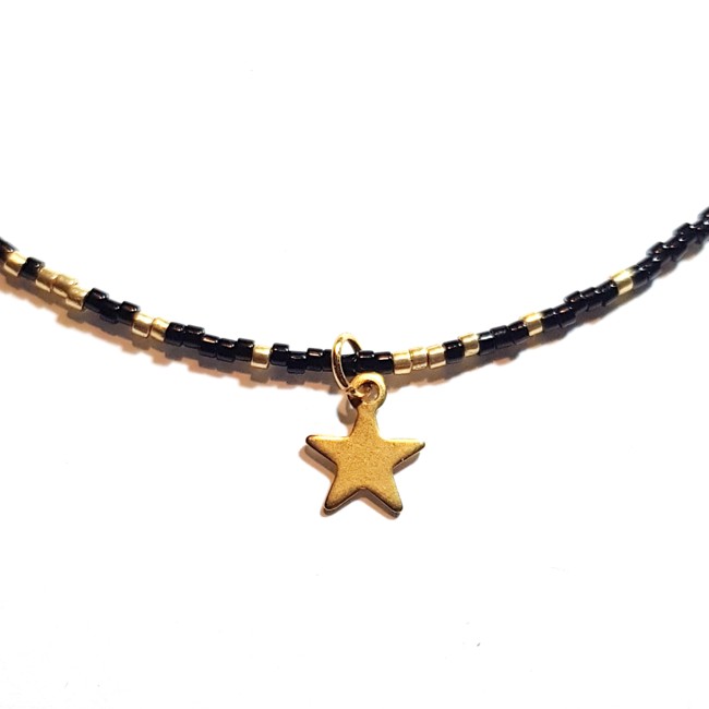 Handgemaakte ketting met fijne Miyuki kralen van glas en verguld Sterling Zilver of 24KT goud geregen in een onregelmatig patroon. Aan de ketting hangt een kleine ster van roestvrijstaal.