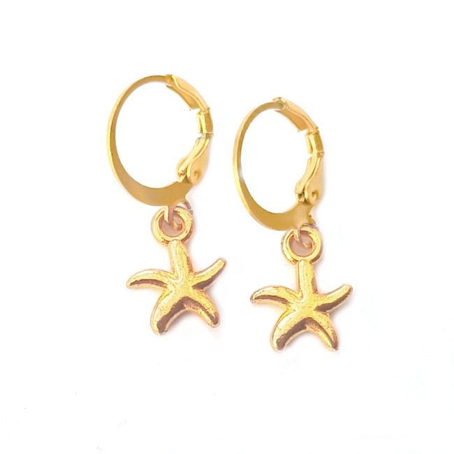 Handgemaakte oorbellen met metalen zeester. De kleine oorringen (12mm) zijn van RVS dus allergievrij. Leuk om solo te dragen maar ook mooi in combinatie met andere oorbellen.