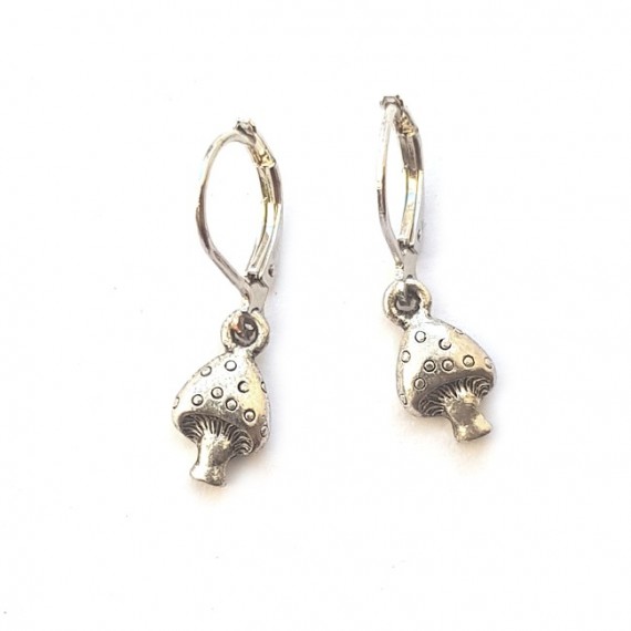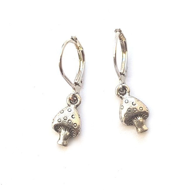 Handgemaakte oorbellen met een klein paddenstoeltje van nikkelvrij metaal.