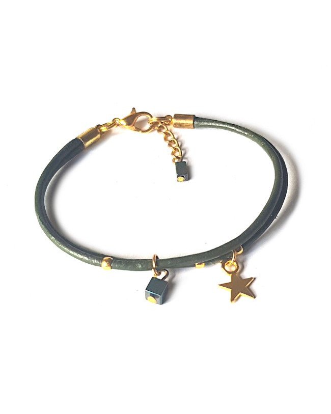 Subtiele maar toch opvallende handgemaakte armband van fijn leder (2mm) met metalen ster en kraal van hematiet. De armband heeft een symbolische betekenis wat maakt dat deze ook perfect is om cadeau te geven. Uiteraard ook mooi in combinatie met andere armbanden.
