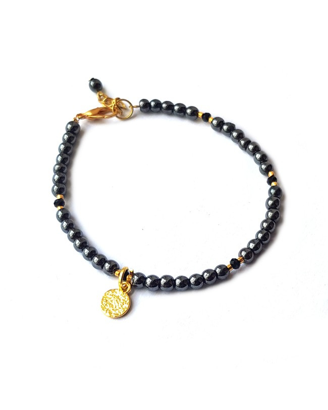 Handgemaakte armband met kralen van halfedelsteen (4mm) en facetglas. Speels door de ronde bedel en mooi in combinatie met andere armbanden.