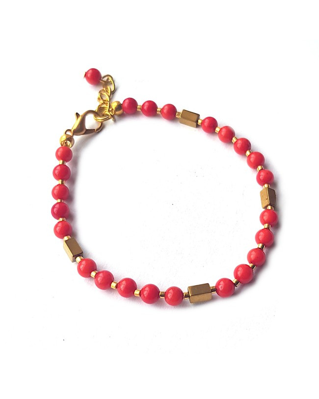 Handgemaakte armband met ronde kralen van koraal (4mm) en rechthoekige kralen van hematiet (goud- of zilverkleurig). De armband staat erg leuk in combinatie met andere armbanden.