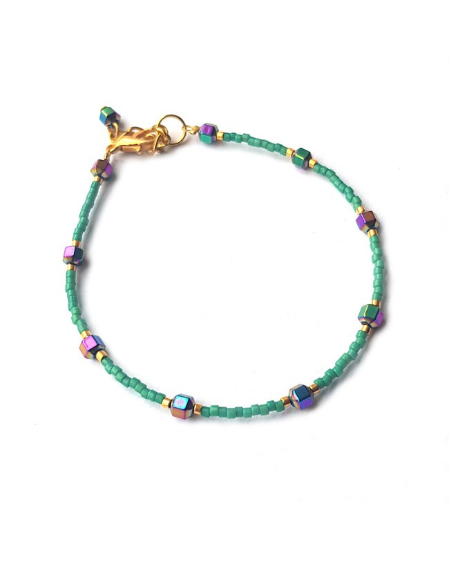 De armband is gemaakt met zeer fijne miyuki kralen van glas (groen en silver- of goldplated) en kleine facetkralen van hematiet (4x3 mm) in een mooie kleurschakering. Afgewerkt met een roestvrijstalen sluiting en verlengketting. Super om te dragen met andere armbanden!